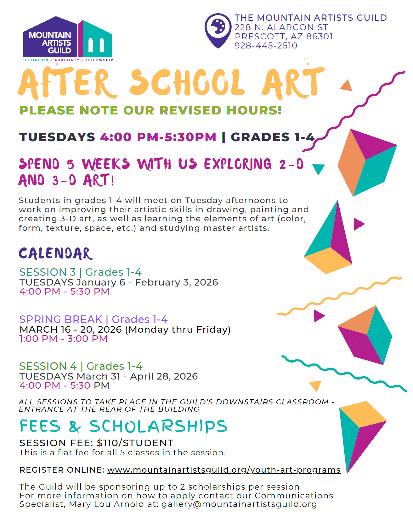 *All sessions to take place in the guild’s lower level classroom. Entrance is at the rear of the building at 228 N. Alarcon Street, Prescott